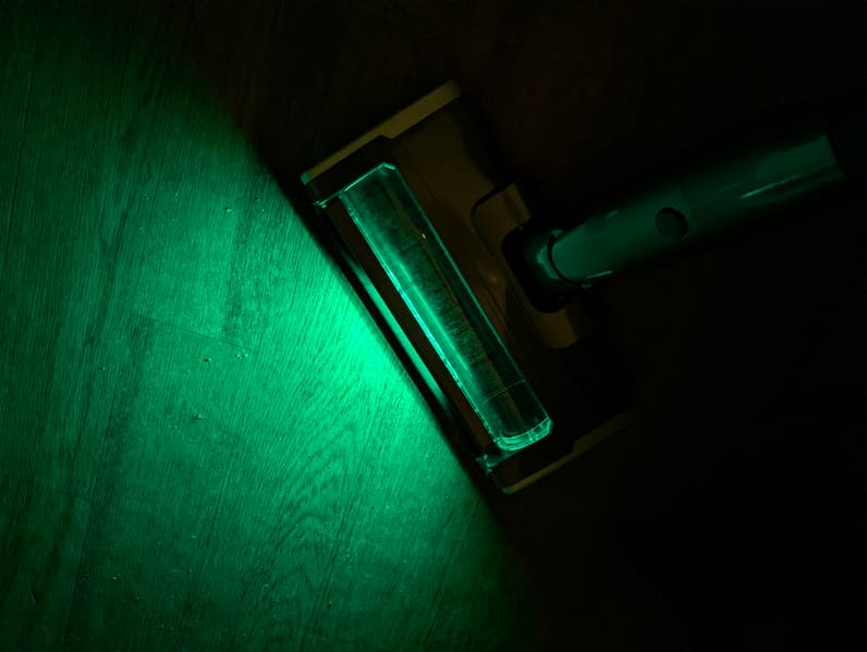 Яркая зеленая подсветка рабочей зоны очень помогает при уборке неосвещенных помещений. Благодаря низкому размещению источников света мелкий мусор на полу становится хорошо заметен. Эффективна подсветка и при дневном освещении.