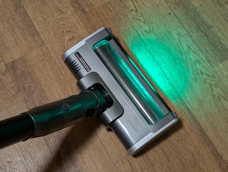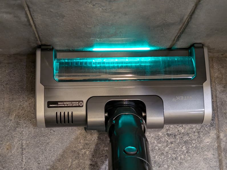 В передней части насадки размещен дополнительный ролик из велюра: он, согласно описанию производителя, призван облегчить уборку в углах и у стен. Ролик снабжен электроприводом и вращается синхронно с основным ротором. Над ним можно видеть блок светодиодной подсветки рабочей зоны.