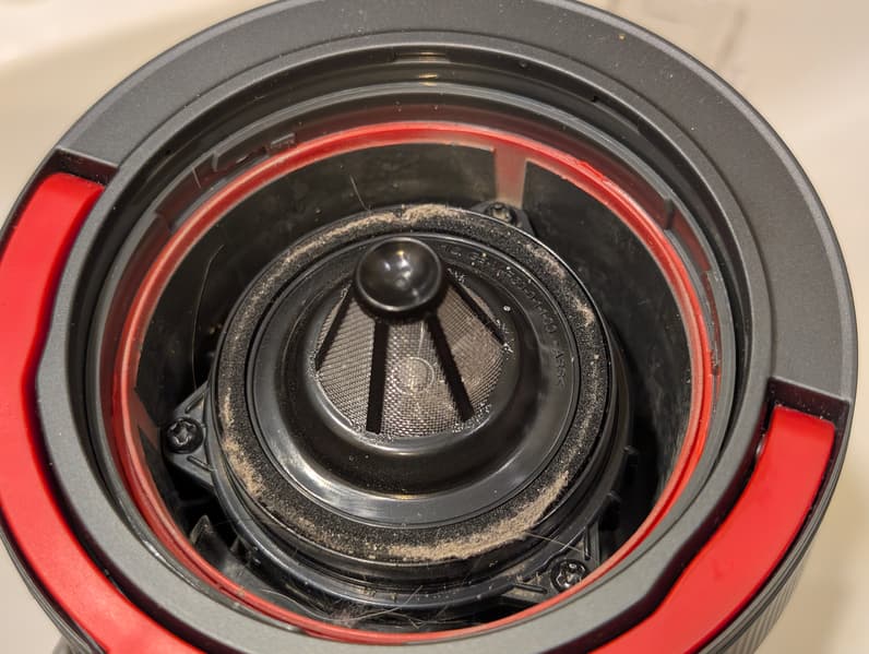 Основная часть мусора остается в контейнере и внутри пластикового мультициклона: до фильтра тонкой очистки долетает очень немного самой мелкой пыли.