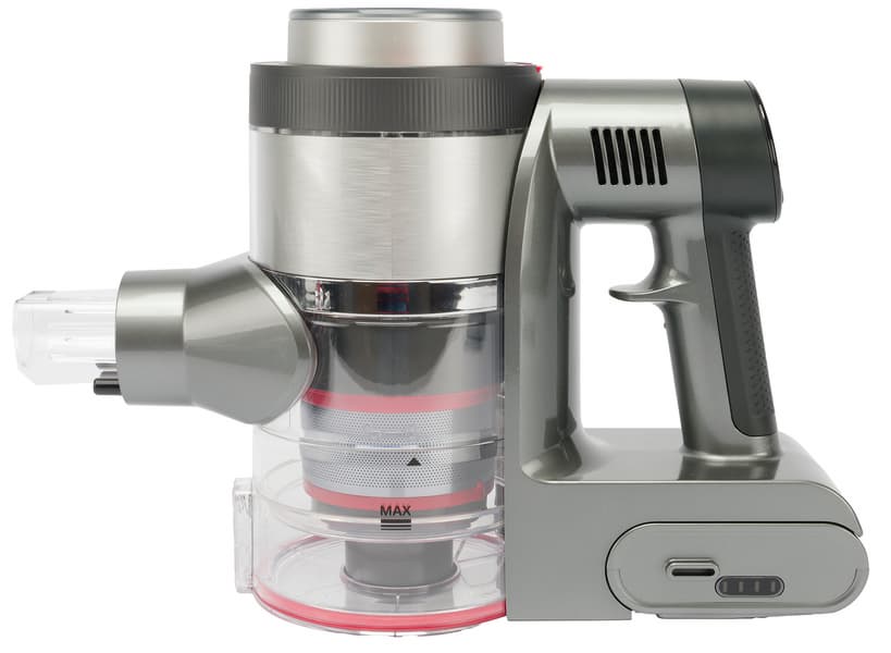 Циклонный фильтр с контейнером для мусора расположен перпендикулярно воздушному тракту. В верхней части корпуса размещен фильтр тонкой очистки, а двигатель установлен ближе к пользователю, над пистолетной рукояткой.