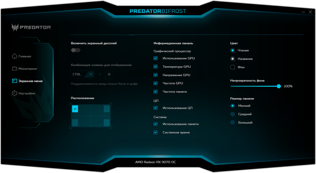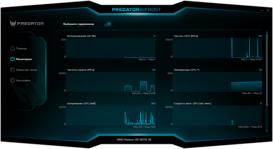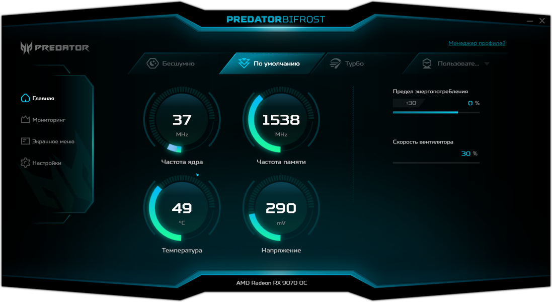 Для управления работой карт серии Predator производитель поставляет фирменную утилиту. Можно управлять вентиляторами, частотами работы и вольтажами, а также выбирать из трех заранее запрограммированных предустановок. Кроме того, программа выдает мониторинг состояния карты, а также можно настраивать работу OSD (в играх).
