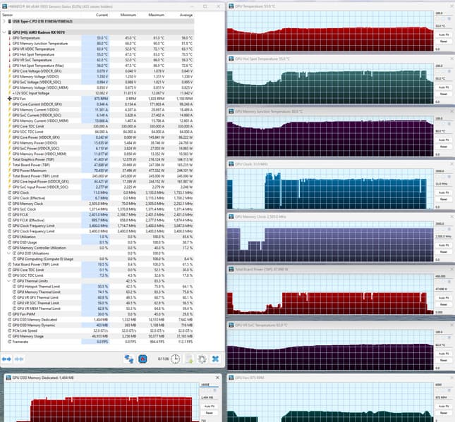 После прогона под нагрузкой максимальная температура ядра не превысила 61 градуса (hot spot — 83 °C; допускается нагрев до 110 градусов), а микросхем памяти — 90 °C, что является хорошим результатом. Энергопотребление карты доходило до 247 Вт.