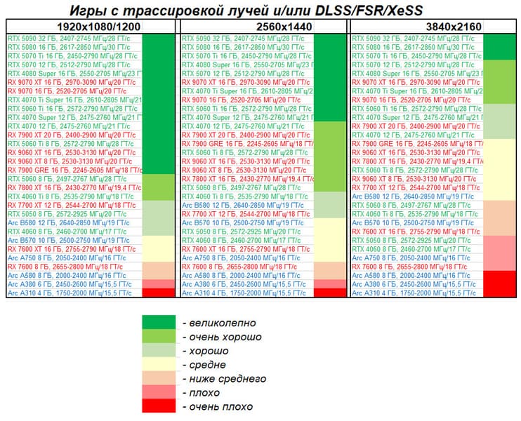 Результаты тестов со включенной аппаратной трассировкой лучей и/или DLSS/FSR/XeSS в разрешениях 1920×1080, 2560×1440 и 3840×2160