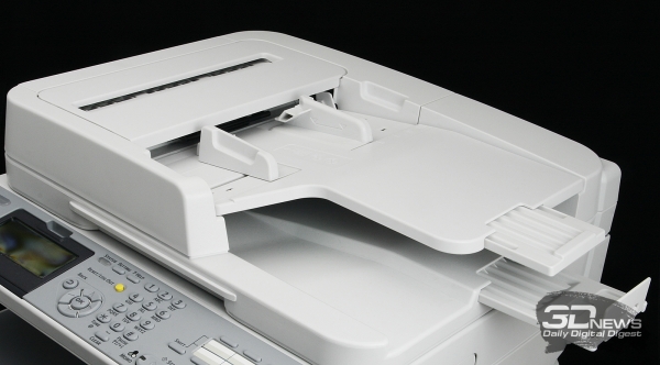 Сверху находится крышка сканера со встроенным модулем автоматической подачи, который поддерживает функцию автоматического двухстороннего сканирования. В лотке автоподачи и его приёмном отсеке имеется по телескопической подпорке, которые предназначены для работы с крупными носителями формата Legal.