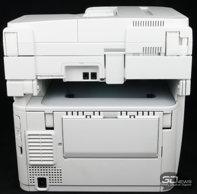 Сзади находится пара разъёмов RJ-11, предназначенных для подключения к телефонному аппарату и телефонной линии, разъём для кабеля питания, вентиляционная решётка, а также тыльный раскладной 2-сегментный приёмный лоток. Последний используется в случае печати на плотных носителях, дабы избежать их замятия. Разумеется, в таком случае носители загружаются в откидной лицевой лоток подачи.