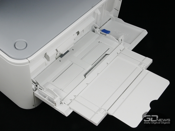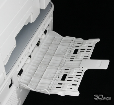 Спереди большую часть поверхности занимает раскладной 3-сегментный лоток для подачи плотных листов и конвертов. Ниже находится основная кассета для бумаги. Тут есть регуляторы ширины носителя и глубины лотка. По умолчанию в лоток помещаются листы формата А4/Letter, но при необходимости его можно раздвинуть до формата Legal. Стоит отметить, что, если увеличить размер кассеты, она нигде не выступает за пределы корпуса, что с эстетической точки зрения является серьёзным достоинством — вот только формат Legal в наших широтах не в фаворе. Также спереди находятся разъём USB и клавиша питания. Приёмный лоток, если его так можно назвать, располагается между модулями принтера и сканера. Производителем заявлено, что ёмкость приёмного лотка составляет всего-то 150 листов, но на практике сюда помещается гораздо больше без вреда для устройства.