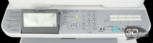Панель управления разбита на несколько блоков. Первый блок включает клавиши быстрого перехода между режимами работы (печать, сканирование, копирование, факс). Подсветка клавиш ядовито-синяя и чрезвычайно яркая. Неподалеку от первого блока находится индикатор, сообщающий о наличии факсимильных сообщений в памяти устройства. Второй блок представляет собой крупный монохромный дисплей с яркой подсветкой белого цвета. Угол наклона экрана ограничен 90 градусами. Третий блок включает клавиши навигации, кнопки статуса (светится в случае возникновения ошибки) и сброса настроек, перехода в меню этих самых настроек и вызова справки. Четвёртый и пятый блоки стандартны для МФУ подобного класса — это цифровая клавиатура и кнопки быстрого набора. Пятый блок включает клавиши цветного и монохромного копирования/сканирования, кнопку остановки, а также клавишу быстрого перехода в спящий режим.