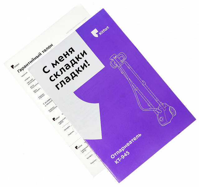 В комплект к отпаривателю Kitfort KT-945 входят ворсовая щетка, зажим для отпаривания брюк, термостойкая перчатка и мини-гладильная доска, предназначенная для проглаживания и отпаривания воротничков рубашек и других труднодоступных деталей.