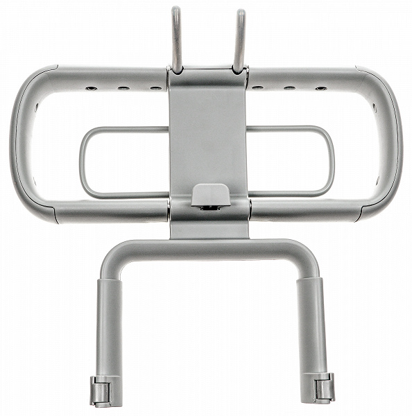 Сверху на стойки надевается пластиковая вешалка сложной формы, которая фиксируется с помощью таких же замочков, как на стойках. Вешалка оснащена подвесом для парового утюжка и откидывающейся горизонтальной планкой. Планка предназначена для вещей, которые неудобно размещать на вешалке: полотенец, косынок, маек и т. п. Если планка не нужна, то ее можно поднять вверх. Ширина вешалки регулируется. Если потянуть за ее края в разные стороны, она раздвигается до ширины в 47 см. Исходная ее ширина — 35,5 см.