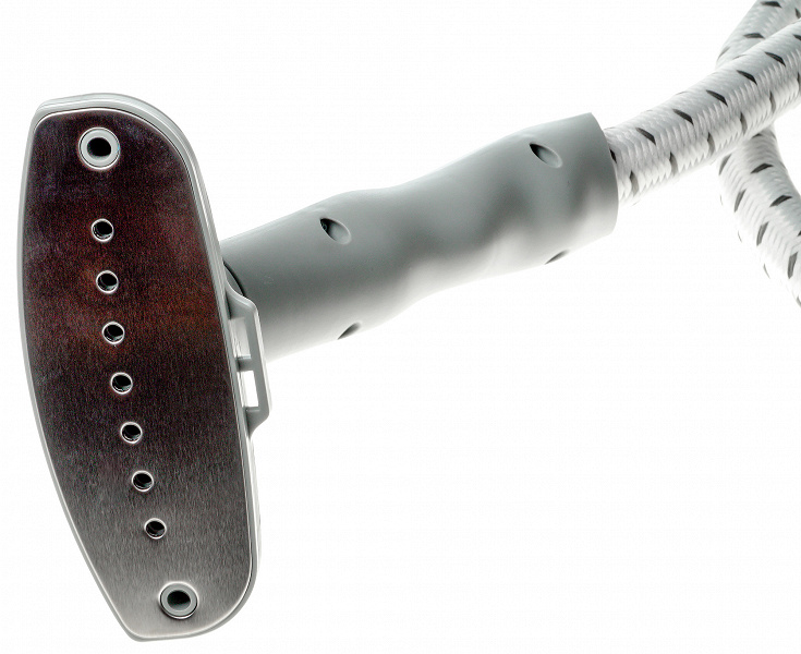 Длина и электрошнура, и парового шланга показались нам достаточными. Шланг подачи пара легко фиксируется на корпусе, не наматывается на стойки и не сминает отпаренные фрагменты одежды. Утюжок имеет удобную форму и вес, рука не устает от него даже при длительной работе.