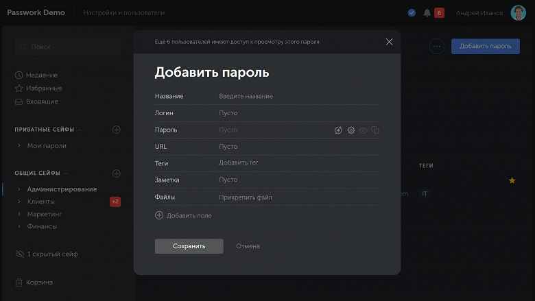 В «Пассворке» предусмотрена возможность делиться паролем с другими пользователями системы (с возможностью редактирования или без таковой), создавать публичные ссылки с ограниченным сроком действия и числом использований, а также просматривать, кто получил доступ к каждому паролю. Это требуется, когда срочно нужно предоставить доступ сотруднику, который не зарегистрирован в системе.