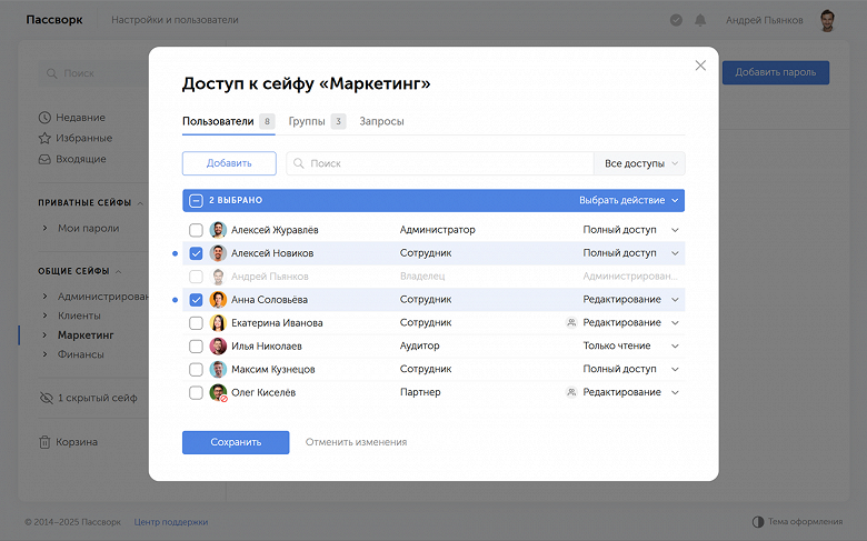 Пользователи могут регистрироваться сами по приглашению (коду), а администратор может заранее задать, какие роли получит новый сотрудник. Как было упомянуто, поддерживается синхронизация с LDAP/AD. При этом пользователь не получает доступ ко всем сейфам группы автоматически, для этого требуется подтверждение администратора сейфа (разработчиком это предусмотрено как дополнительная мера безопасности).
