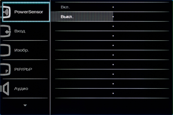 В пункте меню PowerSensor можно активировать работу инфракрасных чувствительных элементов, а также задать один из уровней срабатывания.