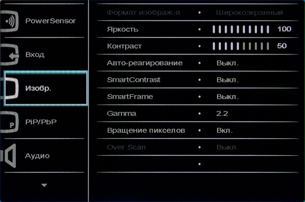 Пункт «Изображение» отвечает за общие настройки картинки и яркостные характеристики. Здесь, например, помимо обычных регулировок яркости и контрастности, можно выбрать показатель передаточной функции монитора, увеличить отклик матрицы, активировать оверскан, а также включить несколько фирменных функций улучшения качества изображения: SmartContrast, SmartFrame, «Авто-реагирование» и «Вращение пикселов». Понять назначение режимов с переведенными на русский язык названиями, к сожалению, не удалось: в официальной инструкции про них не сказано ни слова. Кроме того, этот пункт позволяет выбрать соотношение сторон входящего сигнала.