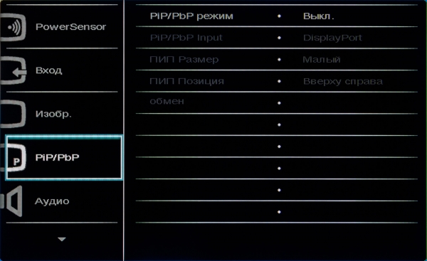 Подменю с загадочным, на первый взгляд, названием PiP/PnP отвечает за настройки и взаимное расположение окон воспроизведения двух сигналов, поступающих одновременно.