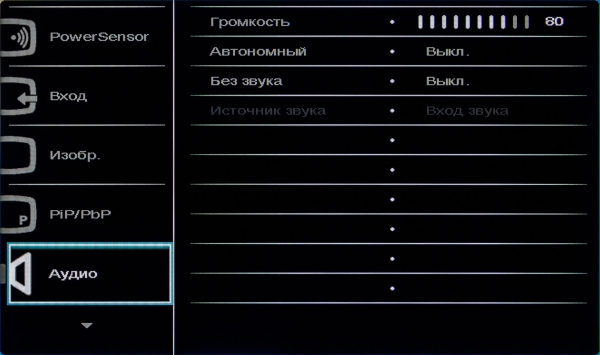 В пункте «Аудио» пользователю доступна регулировка громкости, а также такие параметры звука, как автономный режим, полное отключение сигнала и настройка аудиосоставляющей, поступающей по интерфейсу HDMI или DisplayPort.