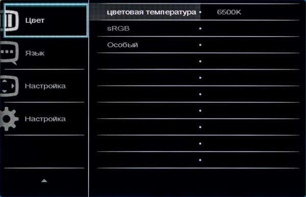 Пункт «Цвет» позволяет выбрать одну из предустановок цветовой температуры (всего их шесть, соответствующих определенным значениям, и одна sRGB), а также самостоятельно настроить необходимое положение точки белого путем поканальной регулировки базовых цветов.