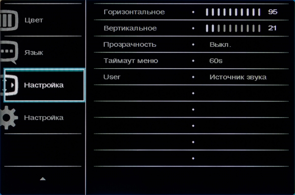 Далее следует пояснить некоторые особенности нашего сегодняшнего гостя. В отличие от модели Philips 271P4Q, где пункты настройки окна меню и монитора назывались соответственно «Настройка меню» и «Настройка», в Philips Brilliance 272P присутствует два подменю с одинаковым названием «Настройка». Если изучить содержание обоих пунктов, то можно выяснить, что ничего принципиально не изменилось, однако поиск нужного параметра несколько усложнился.