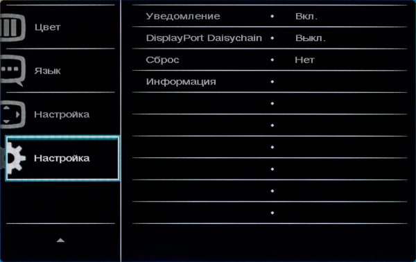 Второй пункт «Настройка» включает в себя различные сервисные функции монитора, такие как активация уведомлений о смене разрешения, предоставление информации о показателях видеоизображения и общий сброс до уровня заводских настроек. Кроме того, здесь можно активировать функцию сквозного шлейфового подключения нескольких мониторов через DisplayPort.
