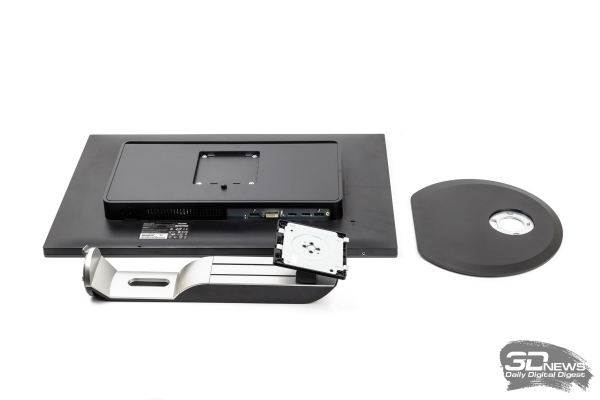 Для более эффективного использования свободного места внутри упаковки разработчики сделали конструкцию сборной и состоящей из трех частей: основания опоры, самой опоры и экранной панели. Сборка доступна даже человеку, ни разу не державшему в руках отвертки: первые две части соединяются при помощи невыпадающего винта, который можно закрутить без использования инструментов, а затем эта сборка монтируется к панели на защелке. После подключения интерфейсных кабелей можно смело приступать к работе.