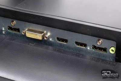 Как мы уже упоминали, разработчики оснастили дисплей всеми современными интерфейсами для подключения к источнику видеосигнала. Стоит обязательно рассказать о наличии не просто разъема DisplayPort, а сразу двух портов стандарта 1.2а: входного и выходного. Таким образом, можно реализовать сквозное шлейфовое подключение нескольких устройств, правда, выход видеоадаптера должен поддерживать такую возможность.