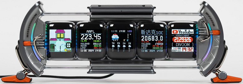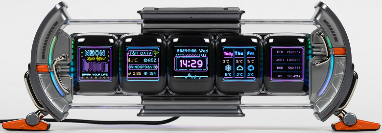 Выглядит гаджет как какой-нибудь космический корабль, основная часть прозрачная — в ней расположены пять модулей дисплеев. По бокам размещены удерживающие всю конструкцию полукруглые элементы с ножками, оранжевые накладки на которых делают дизайн немного более ярким. Устройство явно будет привлекать к себе максимум внимания, особенно во включенном виде — когда заработает подсветка. В данном случае это замечательно — для этого оно и создавалось.