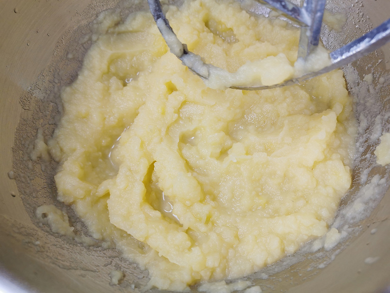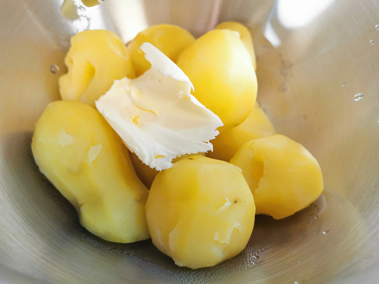 К отварному картофелю мы добавили 20 граммов сливочного масла и, включив миксер, стали через окошко в защитной крышке постепенно вливать стакан горячей воды.