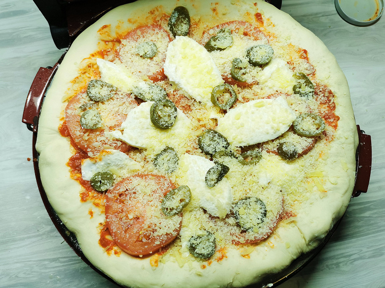 Далее мы раскатали тесто на доске, сформировав неидеальный круг для идеальной домашней пиццы, выложили на тесто начинку — острый томатный соус собственного приготовления, томаты, моцареллу, халапеньо и тертый пармезан. После чего переместили заготовку на разогретую каменную мини-печь и засекли 15 минут.