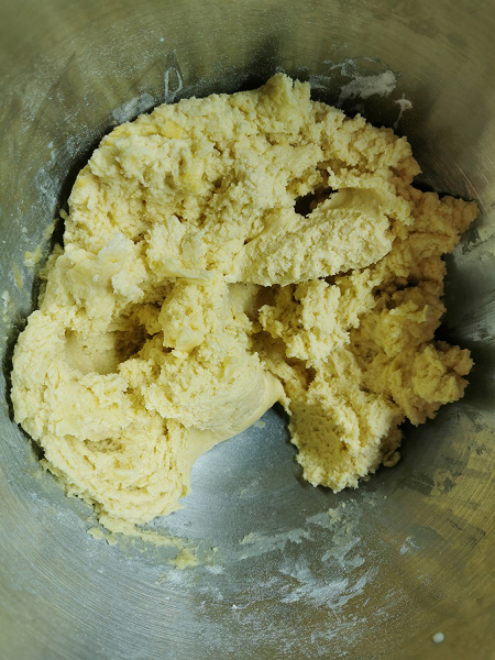 Далее мы добавили яйцо и желток и включили миксер на втором режиме еще на 1,5 минуты. В конце мы добавили муку и замешивали наше тесто 3 минуты на первом режиме.
