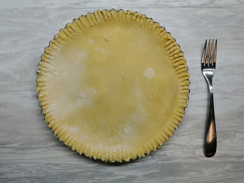 Мы поставили духовку разогреваться до 180 градусов и занялись вторым пластом теста — смочили его по краям водой и накрыли им форму с заготовкой.