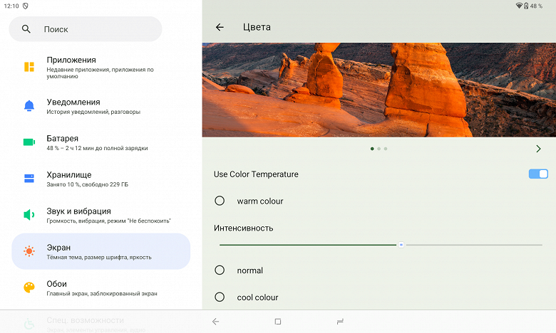 Цвета на экране тестируемого планшета имеют насыщенность близкую к естественной, а цветовой баланс у экранов явно различается.