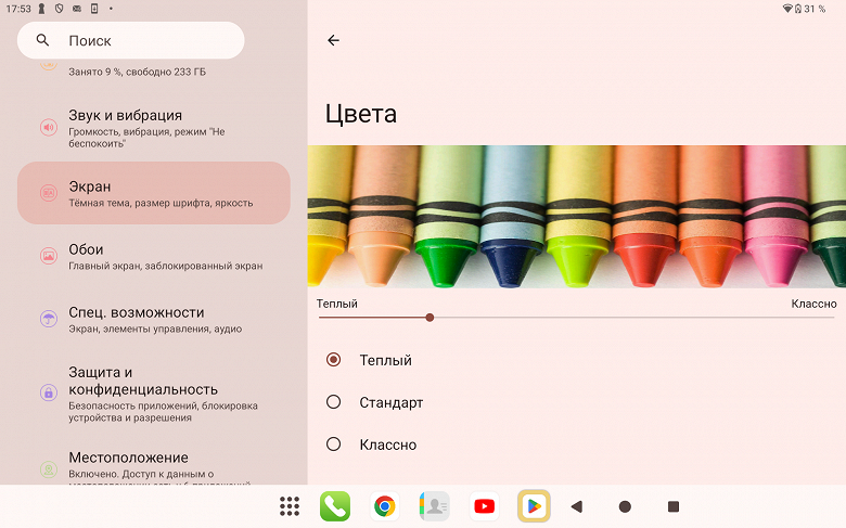 Цвета на экране тестируемого планшета имеют насыщенность близкую к естественной, а цветовой баланс у экранов явно различается.