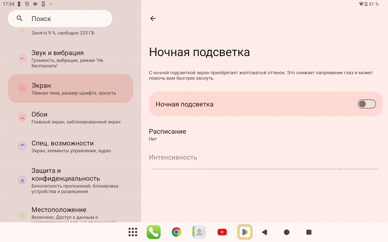 Разумеется нет никакого напряжения глаз, обусловленного именно синим светом. В принципе, яркий свет может приводить к нарушению суточного (циркадного) ритма (см. статью про iPad Pro с дисплеем 9,7 дюйма), но всё решается снижением яркости до низкого, но еще комфортного уровня, а искажать цветовой баланс, уменьшая вклад синего, нет абсолютно никакого смысла. Эту настройку не получится использовать для коррекции цветовой температуры до стандартных 6500 К, так как даже на минимальном уровне коррекции цветовая температура уже слишком низкая — 5600 К, — да и яркость снижается до 230 кд/м², а ее и так не избыток.