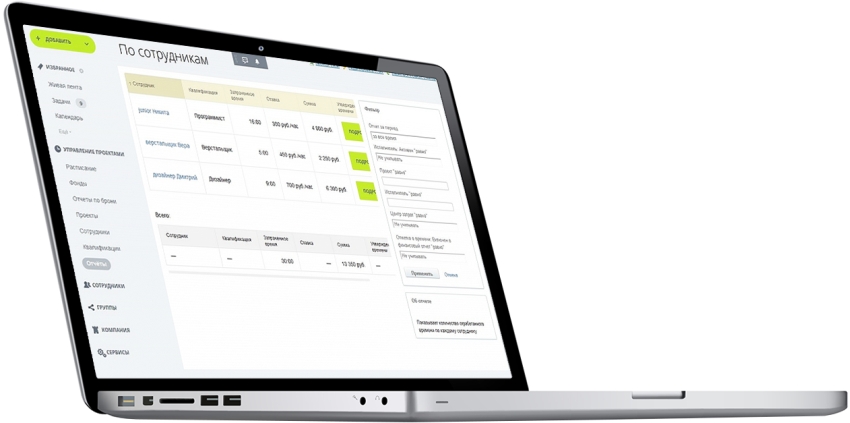 - Система учитывает всё время, потраченное сотрудником на его задачи по проектам, и формирует большой набор различных отчетов, позволяющих автоматизировать сопутствующие бизнес-процессы (ведение бухгалтерского учета, отчеты для руководителей подразделений и директоров по работе с клиентами и т.д.).