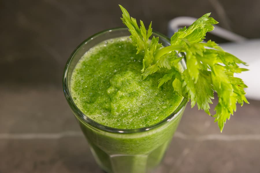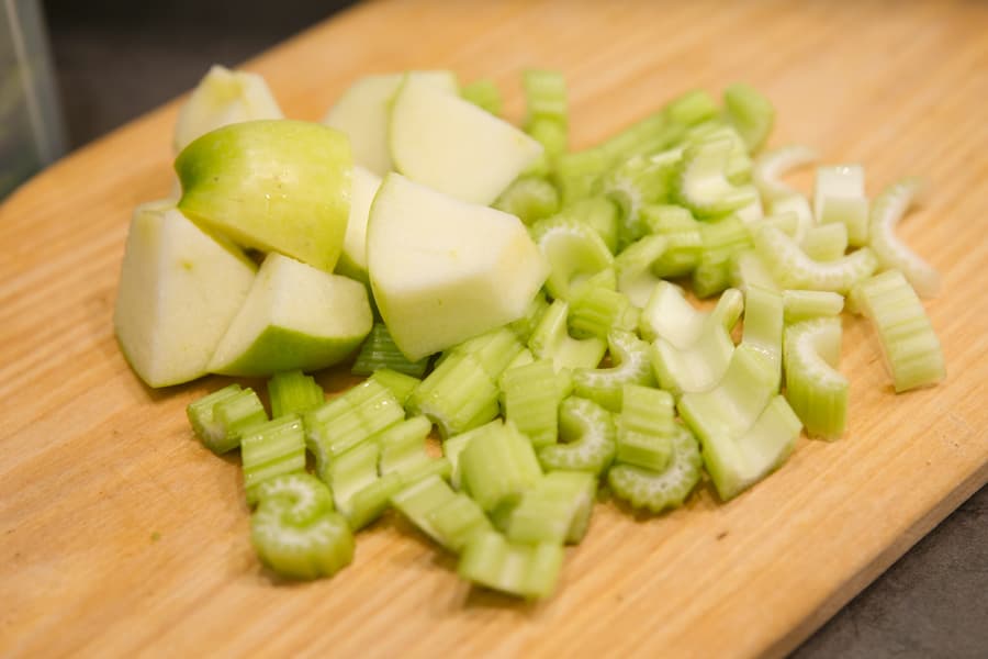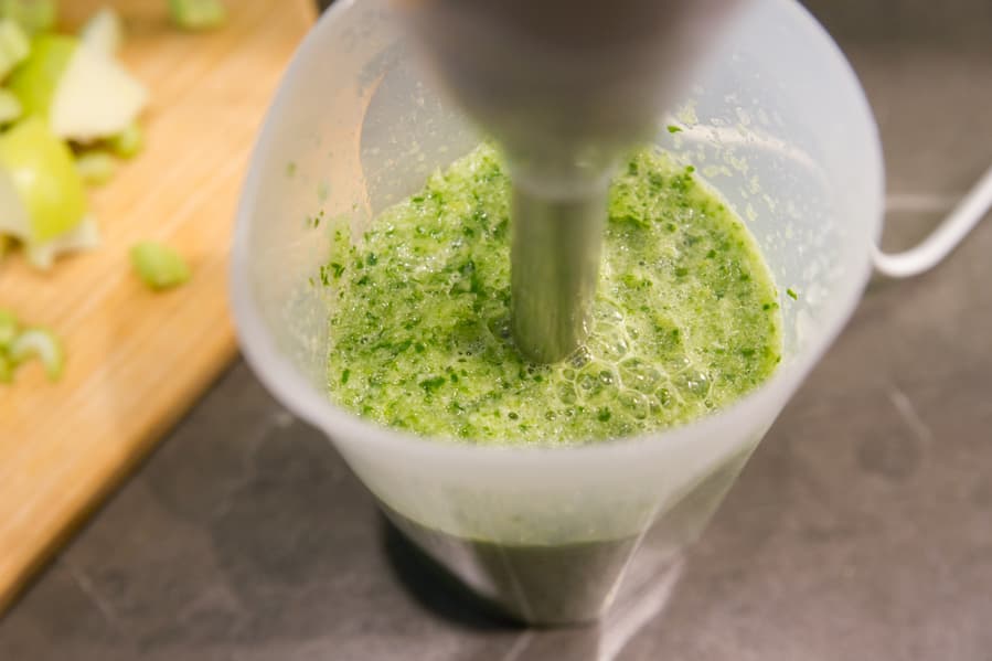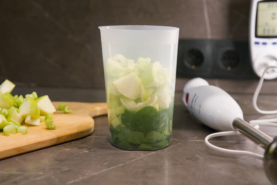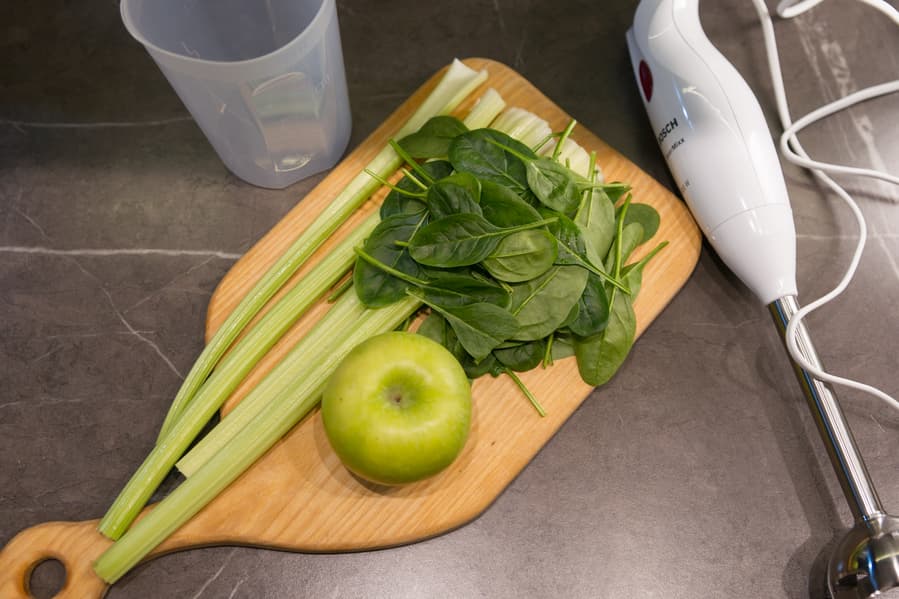 Чтобы проверить, как блендер справится с обработкой твердых и волокнистых ингредиентов, мы уложили в стакан листья шпината, нарезанные стебли сельдерея и дольки зеленого яблока.