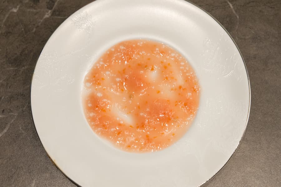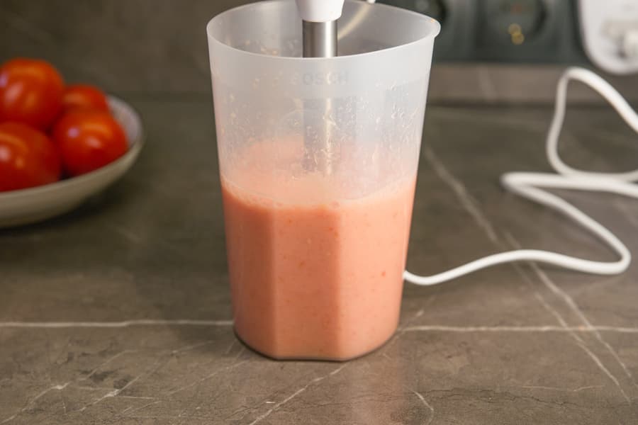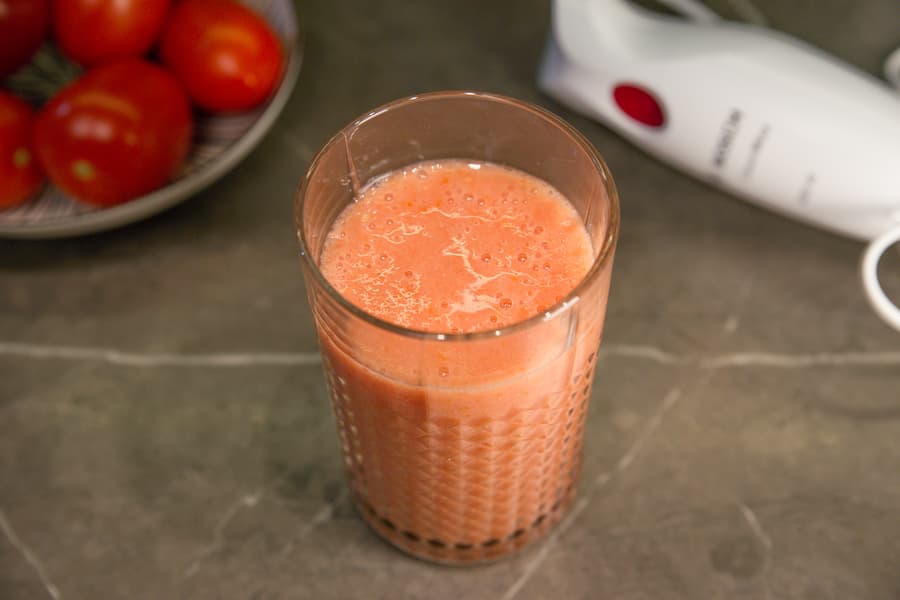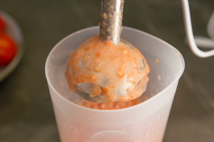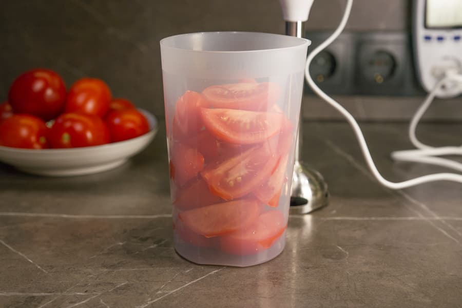 Поместили в стакан 350 г помидорных долек и приступили к измельчению. Через 30 секунд ни одной целой дольки мы уже не увидели. Фрагменты шкурок, всё еще видневшиеся в общей массе, были минимального размера.