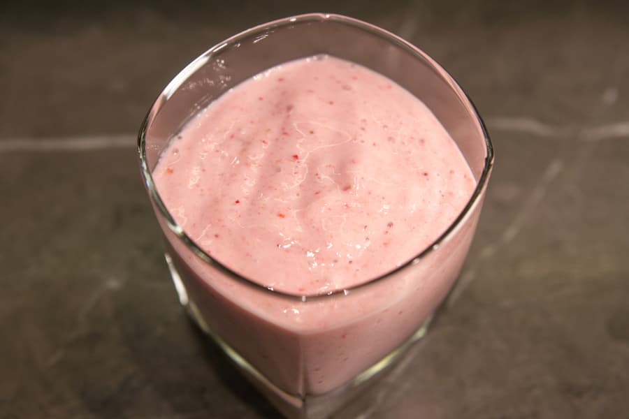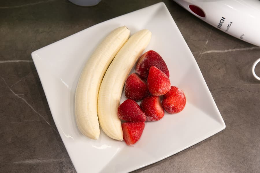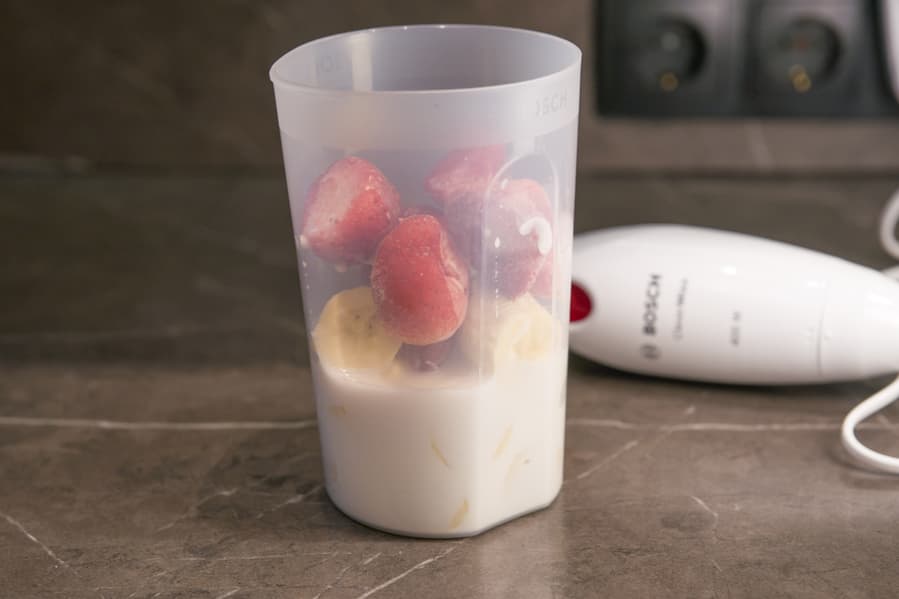 Для следующего теста мы поместили в стакан пару нарезанных бананов и замороженную клубнику. Подлили около 80 мл молока и попробовали превратить всё это в густой вкусный напиток.