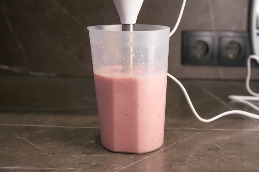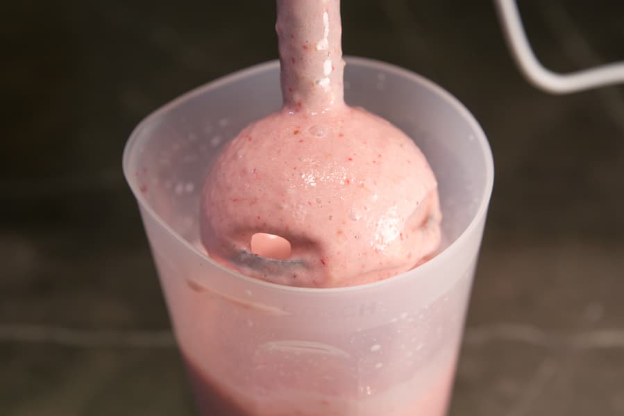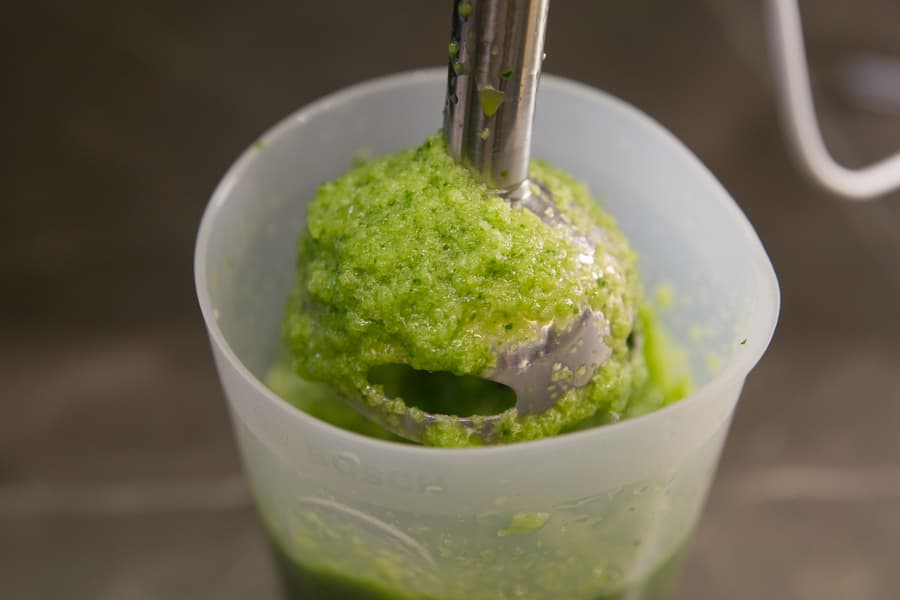 Добавили 50 мл воды, опустили насадку в емкость и включили блендер.