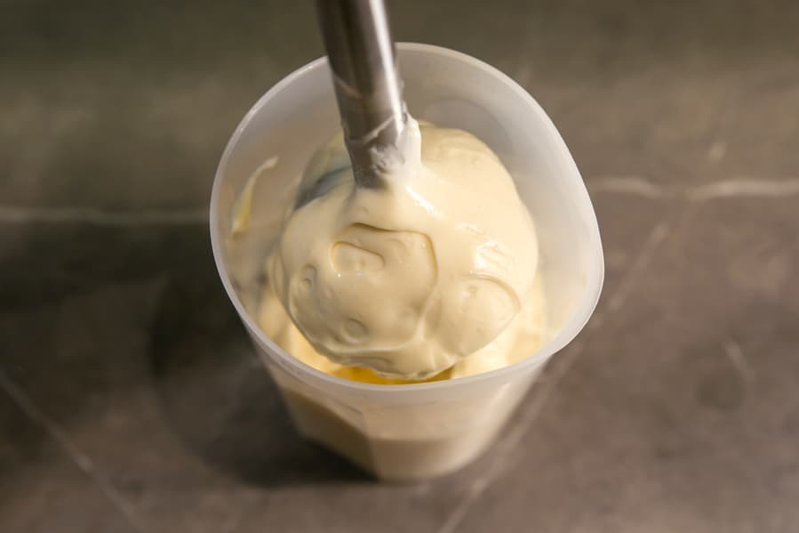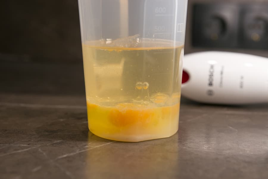 В стакан были помещены: 250 мл рафинированного растительного масла, два яйца общим весом 100 г, 1,5 чайных ложки обычной горчицы, 25 мл свежевыжатого лимонного сока (можно меньше), 3 г сахара и 7 г соли. Все ингредиенты были одинаковой комнатной температуры.