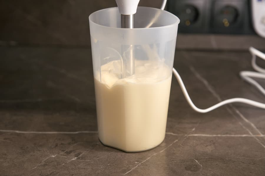 Чашу насадки мы поставили на самое дно, включили блендер и не двигали ее, пока из отверстий не начала выходить белая эмульсия. Затем стали перемещать насадку вверх-вниз и в скором времени, убедившись, что масса превратилась в идеально однородную, остановили мотор.