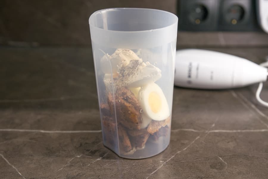 Чтобы проверить, справится ли устройство с обработкой густой вязкой массы, мы поместили в стакан для смешивания 250 г консервированного тунца, вареное яйцо, по столовой ложке густой сметаны и творожного сыра. Полили лимонным соком и поперчили.