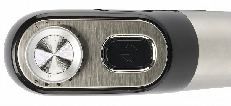 На фронтальной стороне располагаются крупная механическая кнопка включения/выключения, а над ней — колесо регулировки скорости.