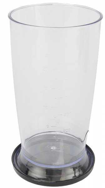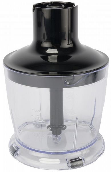 Чаша измельчителя объемом 500 мл, выполнена из прозрачного пластика. На противоположных сторонах чаши есть отметки объема в миллилитрах (от 100 до 500 мл с шагом в 100 мл) и в унциях. Закрывается чаша измельчителя пластиковой крышкой черного цвета, в которую вставляется моторный блок. Крышка вставляется в чашу и фиксируется поворотом по часовой стрелке.