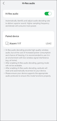 Режим «Hi-Res Audio» включается на отдельной странице, при этом если до момента его активации к наушникам было подключено два источника, второй автоматически отключается. Обо всем, что с ней происходит, гарнитура информирует с помощью голосовых сообщений на английском или китайском языке. Можно заменить их на тоновые сигналы, а также настроить громкость оповещений.