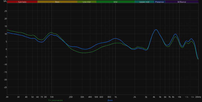 Очень жаль, что в приложении нет полноценного эквалайзера — он бы явно пригодился. Можно, конечно, пользоваться сторонними приложениями, накладывая дополнительную эквализацию на какой-нибудь из предустановленных профилей — тот же «Джаз» выглядит для этого лучшим вариантом. Но это немножко сложно, неудобно, а главное — не гарантирует по-настоящему достойного результата. При этом звучание по умолчанию и с парой-тройкой из предустановленных профилей нельзя назвать однозначно плохим — оно вполне приличное для ультрабюджетной гарнитуры. Баланс, безусловно, далек от нейтрального, но такое звучание придется по вкусу тем, кто предпочитает ярко выраженную V-образную АЧХ — с подчеркнутыми низами и верхами при заметно проваленной середине.