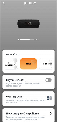Настройка Flip 7 осуществляется через приложение JBL Portable, которое сразу обнаруживает заранее подключенную колонку и проверяет наличие обновлений прошивки. Если находит — предлагает установить. Занимает этот процесс пару-тройку минут.