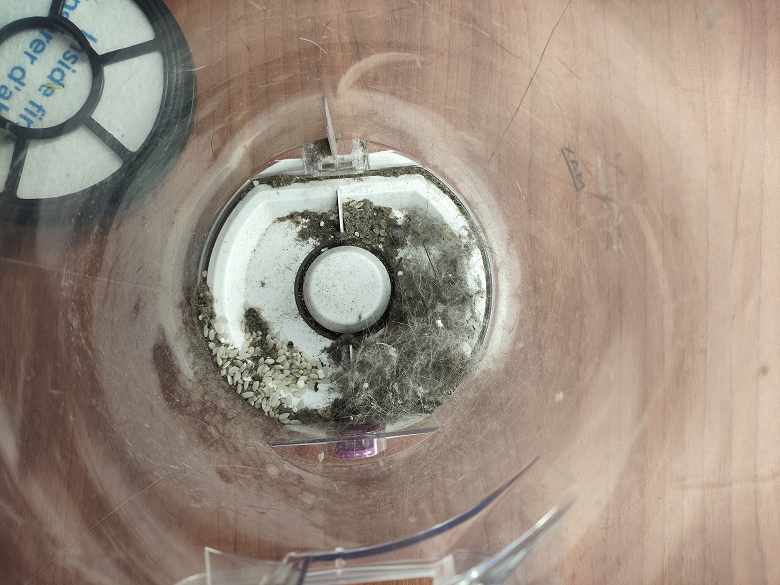 Качество фильтрации мусора в циклонном фильтре мы оцениваем как вполне адекватное. База исправно высасывает все загрязнения — и легкую пыль, и достаточно тяжелые частицы.
