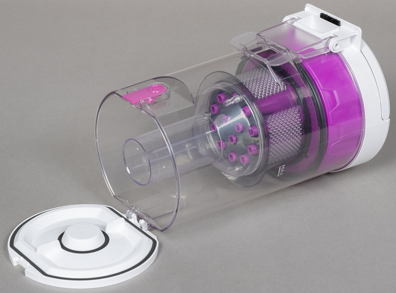 Циклонный фильтр базы можно промывать чистой водой, а вот про губчатый фильтр разработчики нам ничего не сообщили. Предполагаем, что его также можно мыть — ничего страшного нам в этом не видится.