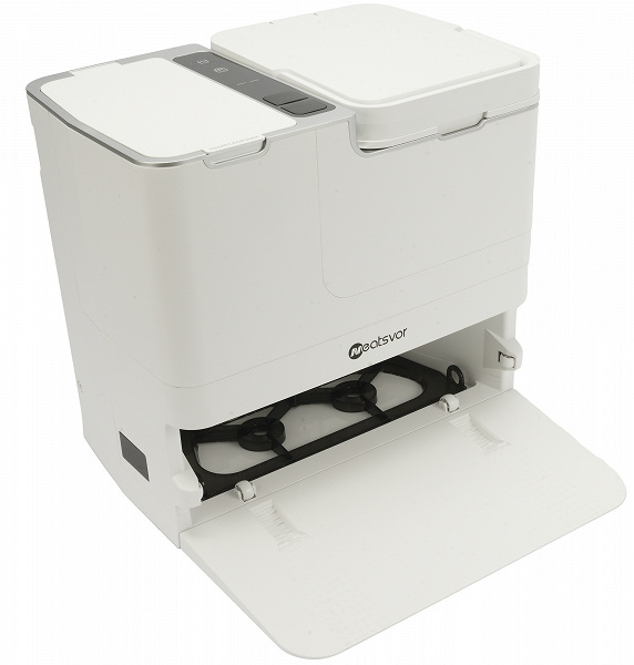 Под откидной крышкой находится отсек для мусора, который впоследствии будет высасываться базой. Чтобы мусор не высыпался во время уборки, воздуховод в контейнере закрыт подпружиненной шторкой.