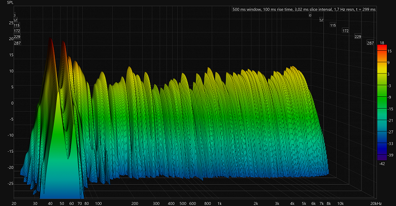 Сочетание динамика и пассивного излучателя позволило «выжать» из небольшого сабвуфера максимум баса, но вот его качество при этом оказалось не самым высоким — НЧ-регистр очень гулкий, что хорошо заметно по графику кумулятивного затухания спектра (он же «водопад» или waterfall). В случае просмотра кино это даже неплохо — взрывы звучат эффектно и вызывают должный эмоциональный отклик, а вот для прослушивания музыки хотелось бы несколько более «плотных и собранных» низких частот.